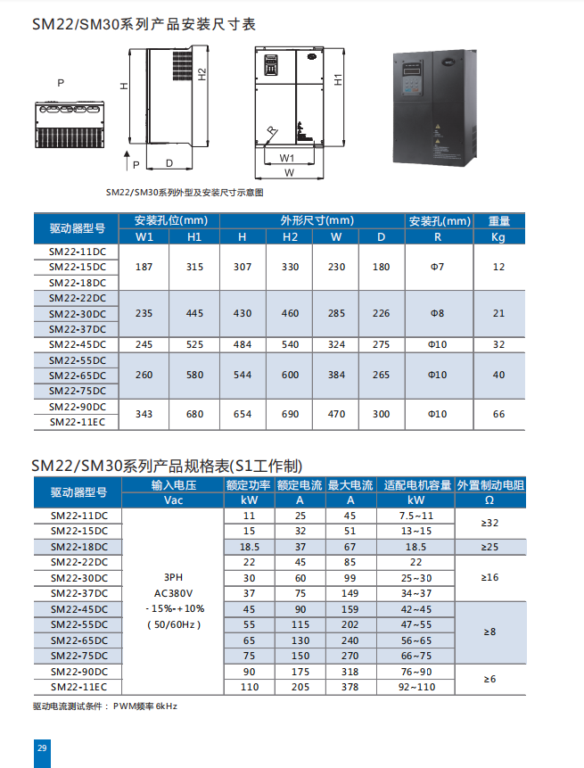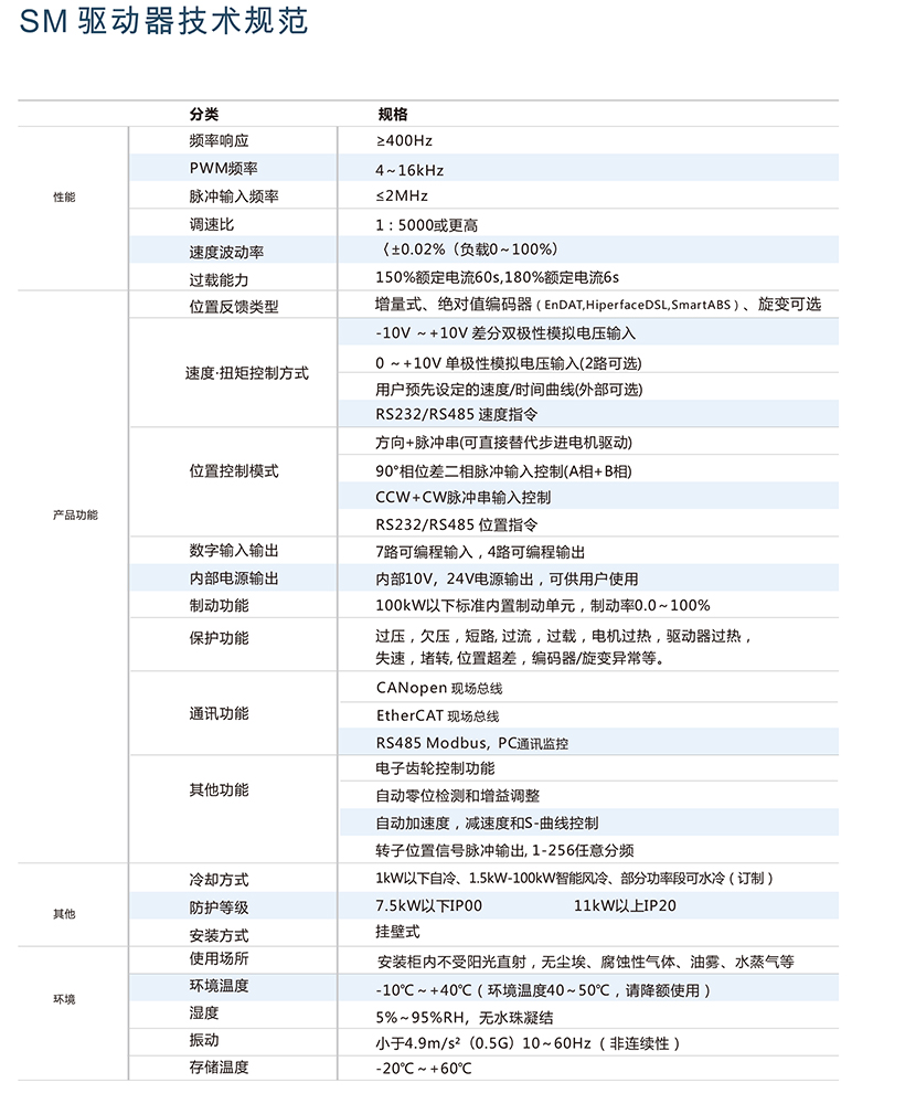 驅(qū)動器型號 輸入電壓 額定功率 額定電流 最大電流 適配電機容量 外置制動電阻 Vac kW A A kW Ω SM22-11DC 3PHAC380V﹣15%-+10%(50/60Hz)11 25 45 7.5~11 ≥32 SM22-15DC 15 32 51 13~15 SM22-18DC 18.5 37 67 18.5 ≥25 SM22-22DC 22 45 85 22 ≥16 SM22-30DC 30 60 99 25~30 SM22-37DC 37 75 149 34~37 SM22-45DC 45 90 159 42~45 ≥8 SM22-55DC 55 115 202 47~55 SM22-65DC 65 130 240 56~65 SM22-75DC 75 150 270 66~75 SM22-90DC 90 175 318 76~90 ≥6 SM22-11EC 110 205 378 92~110 驅(qū)動電流測試條件: PWM頻率 6kHz 【V2.0】