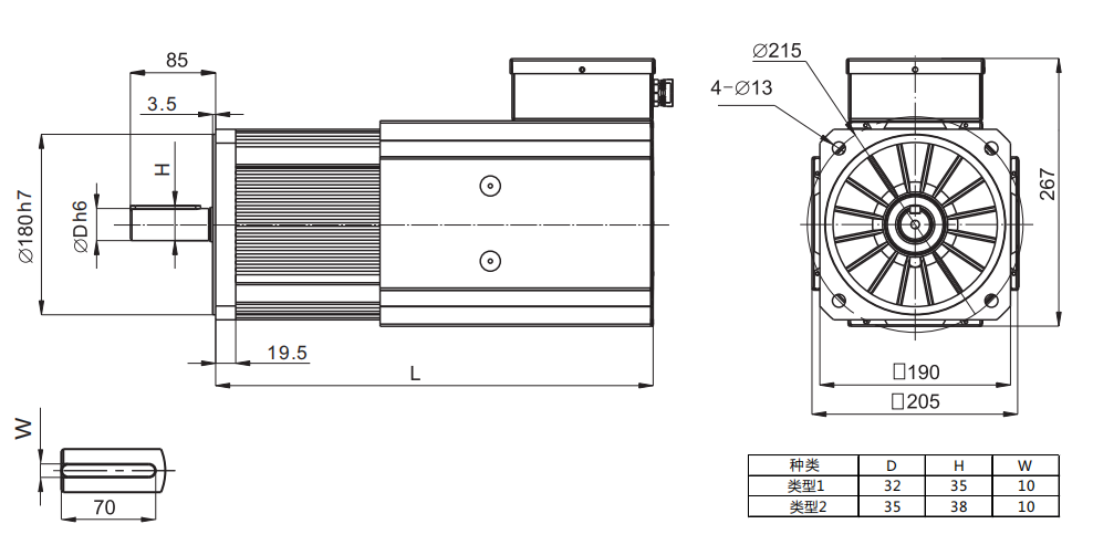 機(jī)座號(hào) 190 型號(hào) 額定扭矩 額定電壓 額定轉(zhuǎn)速 額定功率 額定電流 Kt值 Ke常數(shù) 最高轉(zhuǎn)速 最大扭矩 轉(zhuǎn)子慣量 極數(shù) 重量 L長(zhǎng)度 L長(zhǎng)度(抱閘) N.m Vac rpm kW A N.m/A V/krpm rpm N.m Kg.cm2 Poles Kg mm mm 190H11D30C 35 380 3000 11 25.4 1.6 95 3600 105 68 10 30 341 441 190H11D20C 50 380 2000 11 24.8 2.4 144 2500 158 89 10 33 381 441 190H11D15C 70 380 1500 11 26.8 2.9 176 2000 210 95 10 34 381 441 190H13D17C 70 380 1700 13 30.2 2.6 156 2210 210 95 10 34 381 441 190H15D20C 72 380 2000 15 33.7 2.4 144 2500 210 130 10 37 441 496 190H22D30C 70 380 3000 20 48.4 1.6 99 3600 210 130 10 37 441 496 190H15D15C 96 380 1500 15 32.0 2.8 171 2000 288 130 10 39 441 496 190H17D17C 96 380 1700 17 37.5 2.8 172 2210 288 130 10 39 441 496 190H20D20C 96 380 2000 20 43.0 2.4 147 2500 288 130 10 39 441 496 190H19D15C 118 380 1500 19 40.0 3.2 195 2000 354 145 10 41 456 516 190H21D17C 118 380 1700 21 45.0 2.9 173 2210 354 145 10 41 456 516 190H25D20C 118 380 2000 25 56.0 2.3 141 2500 354 145 10 41 456 516 190H22D15C 140 380 1500 22 48.0 3.2 195 2000 420 172 10 45 496 556 190H25D17C 140 380 1700 25 55.0 2.8 169 2210 420 172 10 45 496 556 190H29D20C 140 380 2000 29 65.0 2.4 143 2500 420 172 10 45 496 556 電機(jī)絕緣等級(jí):H 熱保護(hù):PT100,KTY可選 防護(hù)等級(jí):IP65(風(fēng)罩部分除外) 接線方式:航空插頭或接線盒 冷卻方式:風(fēng)冷 風(fēng)扇電壓220V 工作制:S1 【V2.0】