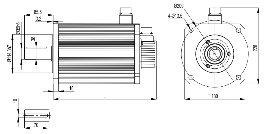 機(jī)座號(hào) 180 V2.0 型號(hào) 額定扭矩 額定電壓 額定轉(zhuǎn)速 額定功率 額定電流 Kt值 Ke常數(shù) 最高轉(zhuǎn)速 最大扭矩 轉(zhuǎn)子慣量 極數(shù) 重量 L長(zhǎng)度 L長(zhǎng)度(抱閘) N.m Vac rpm kW A N.m/A V/krpm rpm N.m Kg.cm2 Poles Kg mm mm 180H33C15C 21 380 1500 3.3 6.8 3.4 204 2000 63 46.2 10 20 228 270 180H44C20C 21 380 2000 4.4 9.0 2.5 154 2500 63 46.2 10 20 228 270 180H44C15C 28 380 1500 4.4 9.0 3.4 205 2000 84 59.4 10 24 248 290 180H60C20C 28 380 2000 5.9 11.8 2.6 156 2500 84 59.4 10 24 248 290 180H55C15C 35 380 1500 5.5 11.2 3.4 206 2000 105 72.5 10 27 268 310 180H75C20C 35 380 2000 7.3 14.8 2.6 156 2500 105 72.5 10 27 268 310 180H75C15C 48 380 1500 7.5 15.5 3.4 203 2000 143 98.8 10 30 308 350 180H10D20C 48 380 2000 10.0 20.2 2.6 156 2500 143 98.8 10 30 308 350 電機(jī)絕緣等級(jí):H 熱保護(hù):PT100,KTY可選 防護(hù)等級(jí):IP65 接線方式:航空插頭 冷卻方式:自然冷卻 抱閘:可選 工作制:S1