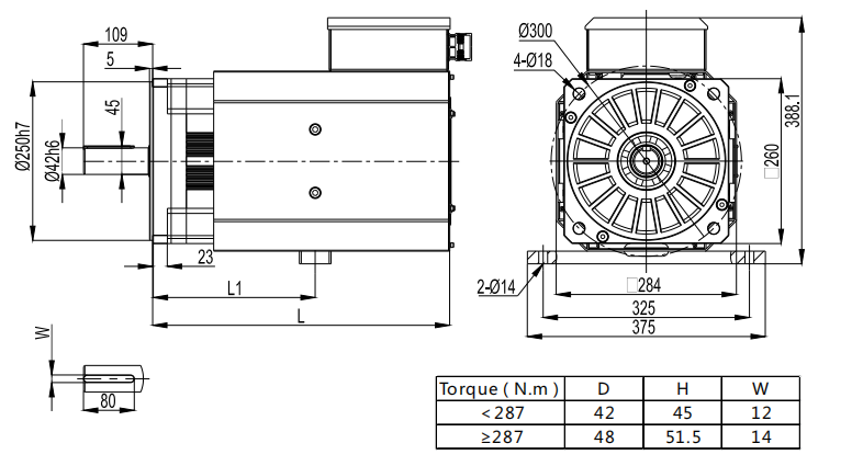 機座號 260 V2.2 型號 額定扭矩 額定電壓 額定轉(zhuǎn)速 額定功率 額定電流 Kt值 Ke常數(shù) 最高轉(zhuǎn)速 最大扭矩 轉(zhuǎn)子慣量 極數(shù) 重量 L長度 N.m Vac rpm kW A N.m/A V/krpm rpm N.m Kg.cm2 Poles Kg mm 260H30D15C 191 380 1500 30 63 3.3 198 2000 573 386 8 95 468 260H34D17C 191 380 1700 34 69 3.0 180 2300 573 386 8 95 468 260H40D20C 191 380 2000 40 81 2.5 153 2500 573 386 8 95 468 260H33D15C 208 380 1500 33 67 3.4 204 2000 624 434 8 105 488 260H37D17C 208 380 1700 37 74 3.0 183 2300 624 434 8 105 488 260H44D20C 208 380 2000 44 89 2.5 153 2500 624 434 8 105 488 260H37D15C 236 380 1500 37 75 3.4 204 2000 708 482 8 112 508 260H42D17C 236 380 1700 42 85 3.0 181 2300 708 482 8 112 508 260H50D20C 236 380 2000 50 105 2.4 147 2500 708 482 8 112 508 260H42D15C 264 380 1500 42 84 3.4 204 2000 792 542 8 123 533 260H47D17C 264 380 1700 47 96 3.0 179 2300 792 542 8 123 533 260H56D20C 264 380 2000 56 112 2.5 153 2500 792 542 8 123 533 260H45D15C 287 380 1500 45 94 3.3 199 2000 861 601 8 134 558 260H51D17C 287 380 1700 51 101 3.1 185 2300 861 601 8 134 558 260H60D20C 287 380 2000 60 120 2.6 156 2500 861 601 8 134 558 260H50D15C 315 380 1500 50 103 3.3 200 2000 945 649 8 141 578 260H56D17C 315 380 1700 56 111 3.1 185 2300 945 649 8 141 578 260H66D20C 315 380 2000 66 134 2.5 154 2500 945 649 8 141 578 260H55D15C 350 380 1500 55 118 3.2 195 2000 1050 745 8 155 618 260H62D17C 350 380 1700 62 129 2.9 177 2300 1050 745 8 155 618 260H73D20C 350 380 2000 73 144 2.6 159 2500 1050 745 8 155 618 260H66D15C 420 380 1500 66 142 3.2 193 2000 1260 900 8 174 698 260H75D17C 420 380 1700 75 160 2.8 172 2300 1260 900 8 174 698 260H88D20C 420 380 2000 88 183 2.5 150 2500 1260 900 8 174 698 260H75D15C 480 380 1500 75 158 3.3 199 2000 1440 1043 8 200 765 260H85D17C 480 380 1700 85 180 2.9 174 2300 1440 1043 8 200 765 260H10E20C 480 380 2000 100 211 2.5 150 2500 1440 1043 8 200 765 260H90D15C 570 380 1500 90 184 3.4 203 2000 1710 1210 8 210 835 260H10E17C 560 380 1700 100 211 2.9 174 2300 1680 1210 8 210 835 260H11E20C 550 380 2000 115 249 2.4 145 2500 1650 1210 8 210 835 電機絕緣等級:H 熱保護:PT100,KTY可選 防護等級:IP65(風(fēng)罩部分除外) 接線方式:航空插頭或接線盒 冷卻方式:風(fēng)冷 風(fēng)扇電壓220V 抱閘電機長度:L+131MM 工作制:S1 【V2.0】